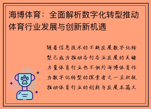 随着信息技术的不断发展,数字化转型已成为推动各行各业发展的关键力量,体育行业也不例外。海博体育作为数字化转型的探索者之一,正积极推动体育行业的创新与发展。本篇文章将从四个方面深入解析海博体育如何通过数字化转型推动体育行业的发展与创新新机遇:一是数字化转型对体育产业结构的重塑,二是数据科技对体育赛事和...