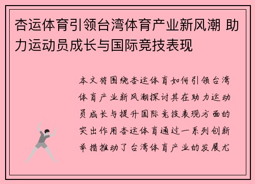 本文将围绕杏运体育如何引领台湾体育产业新风潮,探讨其在助力运动员成长与提升国际竞技表现方面的突出作用。杏运体育通过一系列创新举措,推动了台湾体育产业的发展,尤其在运动员培养、资源整合、竞技表现提升和社会文化影响等方面表现出色。本文从四个主要方面详细分析杏运体育在台湾体育产业中的领导地位,重点阐述其如何通过科学训练体系、国际化资源合作、全方位支持政策及社会责任承担,为台湾体育注入了新的活力。最终,文章将对杏运体育的未来展望及其对台湾体育产业长期发展的影响进行总结。
