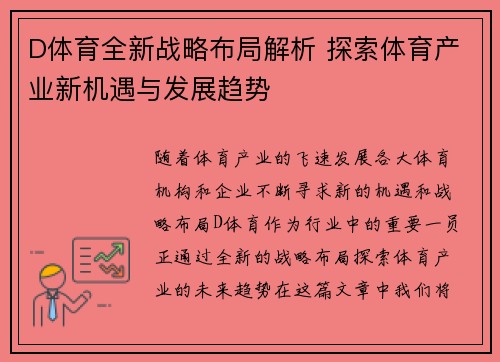 随着体育产业的飞速发展,各大体育机构和企业不断寻求新的机遇和战略布局。D体育作为行业中的重要一员,正通过全新的战略布局探索体育产业的未来趋势。在这篇文章中,我们将详细探讨D体育在体育产业中的新机遇和发展趋势,分析其战略布局背后的深层次意义,以及这些举措如何影响整个行业的格局。
