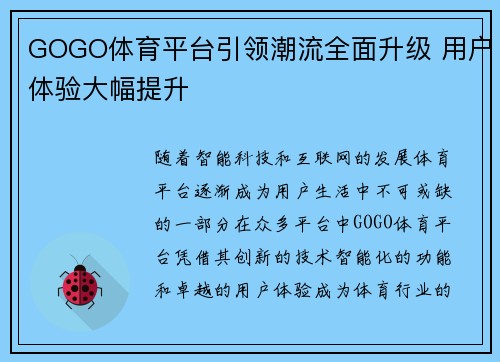随着智能科技和互联网的发展,体育平台逐渐成为用户生活中不可或缺的一部分。在众多平台中,GOGO体育平台凭借其创新的技术、智能化的功能和卓越的用户体验,成为体育行业的佼佼者。为了满足不同用户的需求,GOGO体育平台进行了全面升级,通过不断优化产品和服务,进一步提升了用户体验,确立了行业领先地位。本篇文章将从四个方面详细探讨GOGO体育平台如何引领潮流,全面升级用户体验,具体包括:一流的界面设计、智能化的数据分析、优化的赛事服务以及多元化的互动功能。通过这些方面的升级,GOGO体育不仅提高了平台的操作性和互动性,还实现了用户的个性化需求,进一步推动了行业发展。
